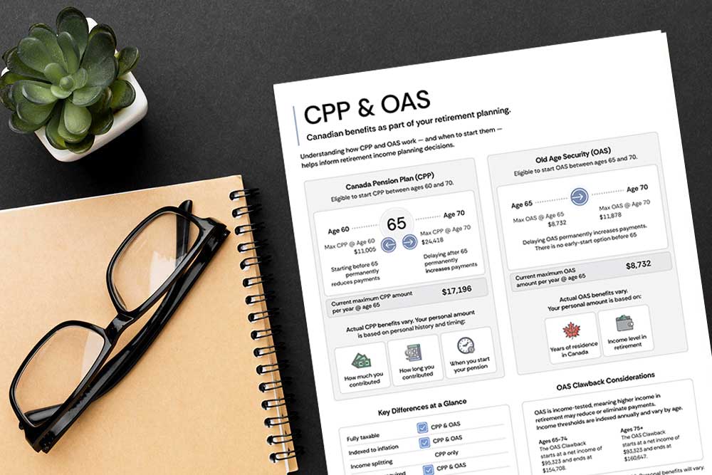 Understanding how CPP OAS retirement benefits work—and how they interact with other income sources—can help retirees make more informed decisions, manage taxes more effectively, and plan for income throughout retirement. This infographic provides a clear, visual overview to support planning conversations and help Canadians better understand their government retirement benefits.